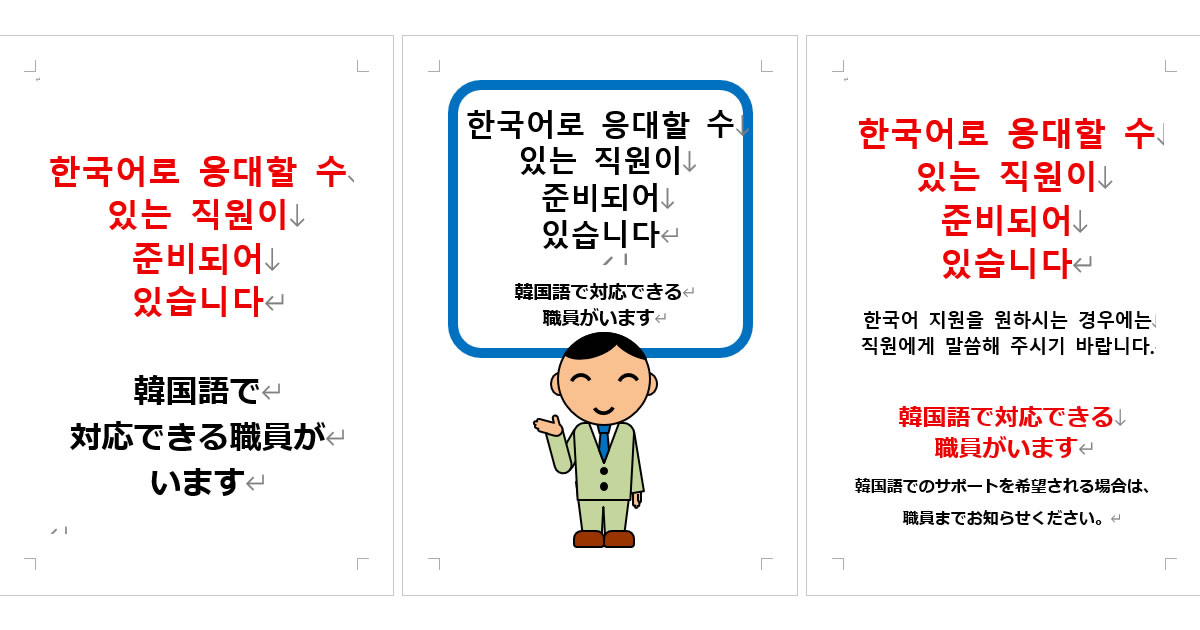 - 観光案内所やイベント受付で掲示し、案内や誘導が韓国語で可能であることを示す。
