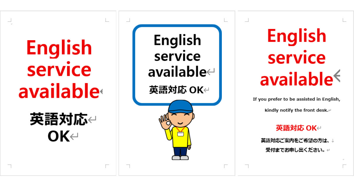 - 観光地の案内所で「英語対応OK」を目立たせるために使用する。