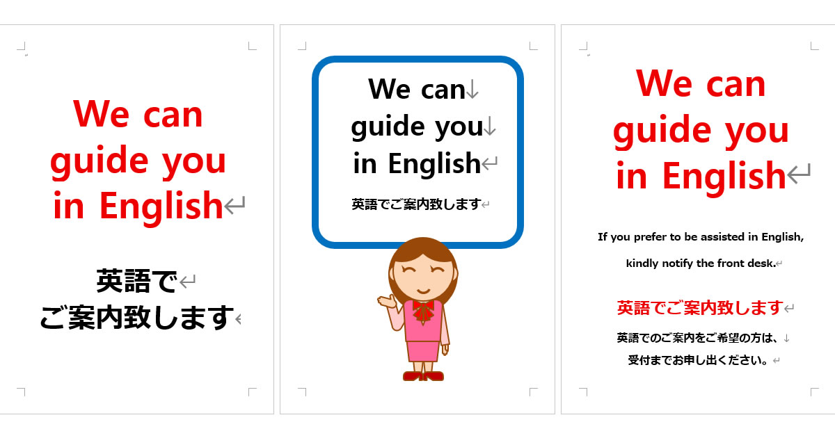 フリーで使える「英語でご案内いたします」の張り紙です。オフィスワード(Office Word)のdocx形式ファイルになります。A4縦型で文字だけ、文字+イラスト、アイコンなど4パターン用意しています。
